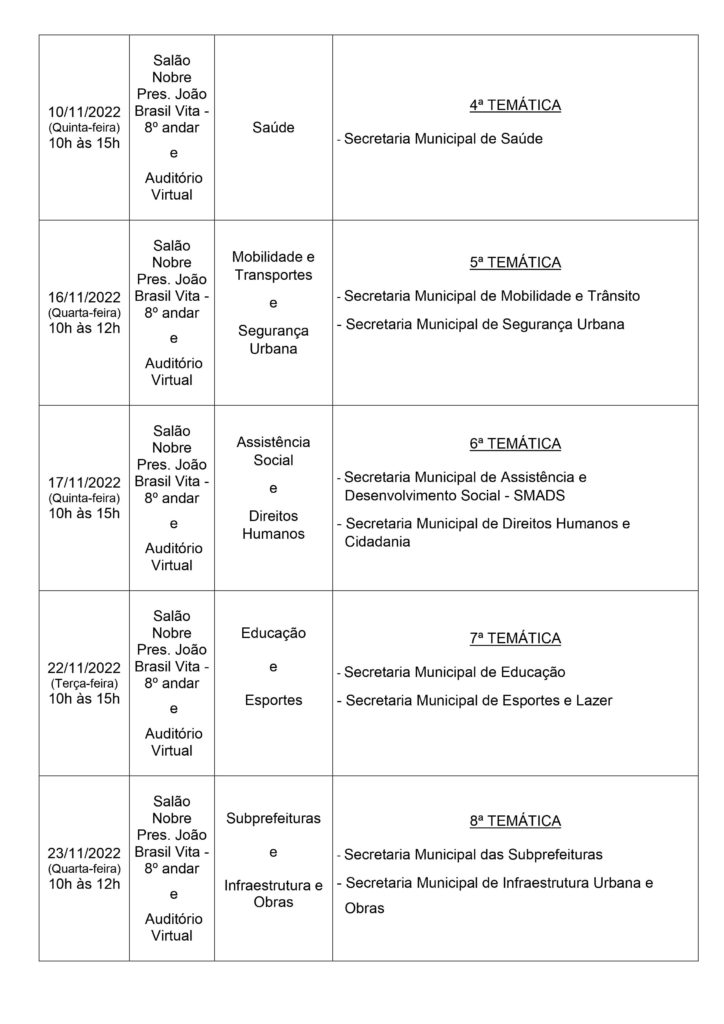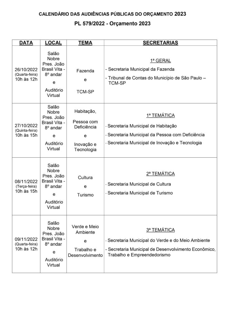 Uma das formas de decidirmos o futuro de uma cidade é o planejamento do orçamento anual. Em São Paulo, a câmara inicia as audiências públicas do orçamento 2023. Compareça e compartilhe com os movimentos, organizações, associações e moradores. Veja o calendário aqui: